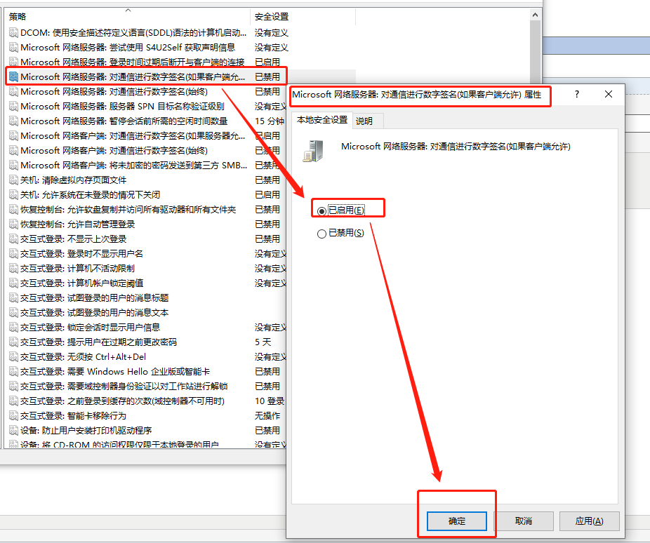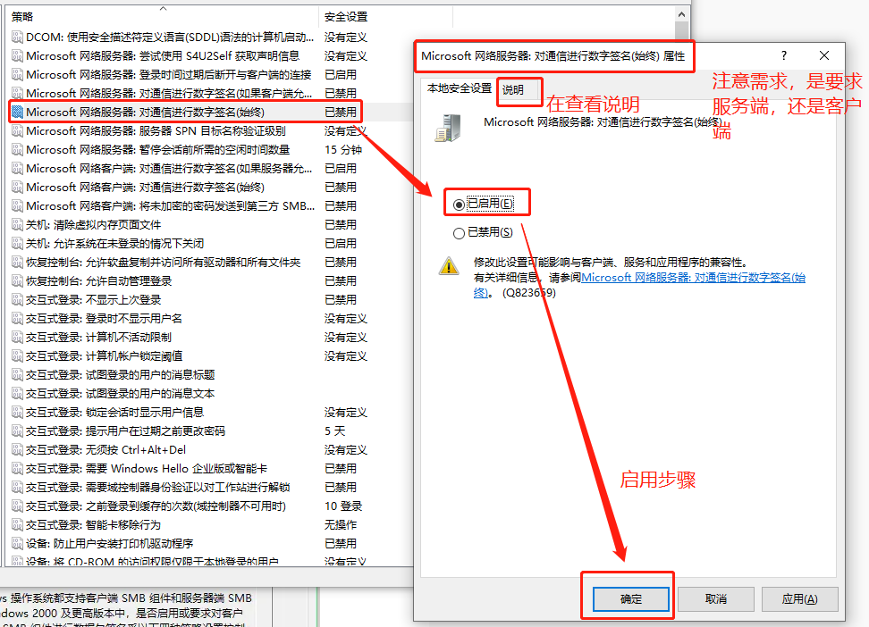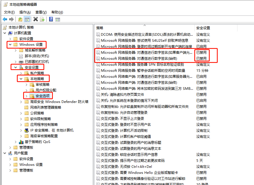 3)、 如果是服务端需要启用SMB签名,请启用Microsoft网络服务器:对通信进行数字签名(始终)。