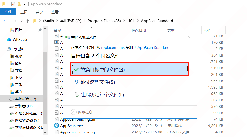 手动覆盖将两个后缀.dll补丁文件覆盖到安装路径下替换文件至安装目录(默认是C:\Program Files (x86)\HCL\AppScan Standard)选择替换然后就能成功安装
